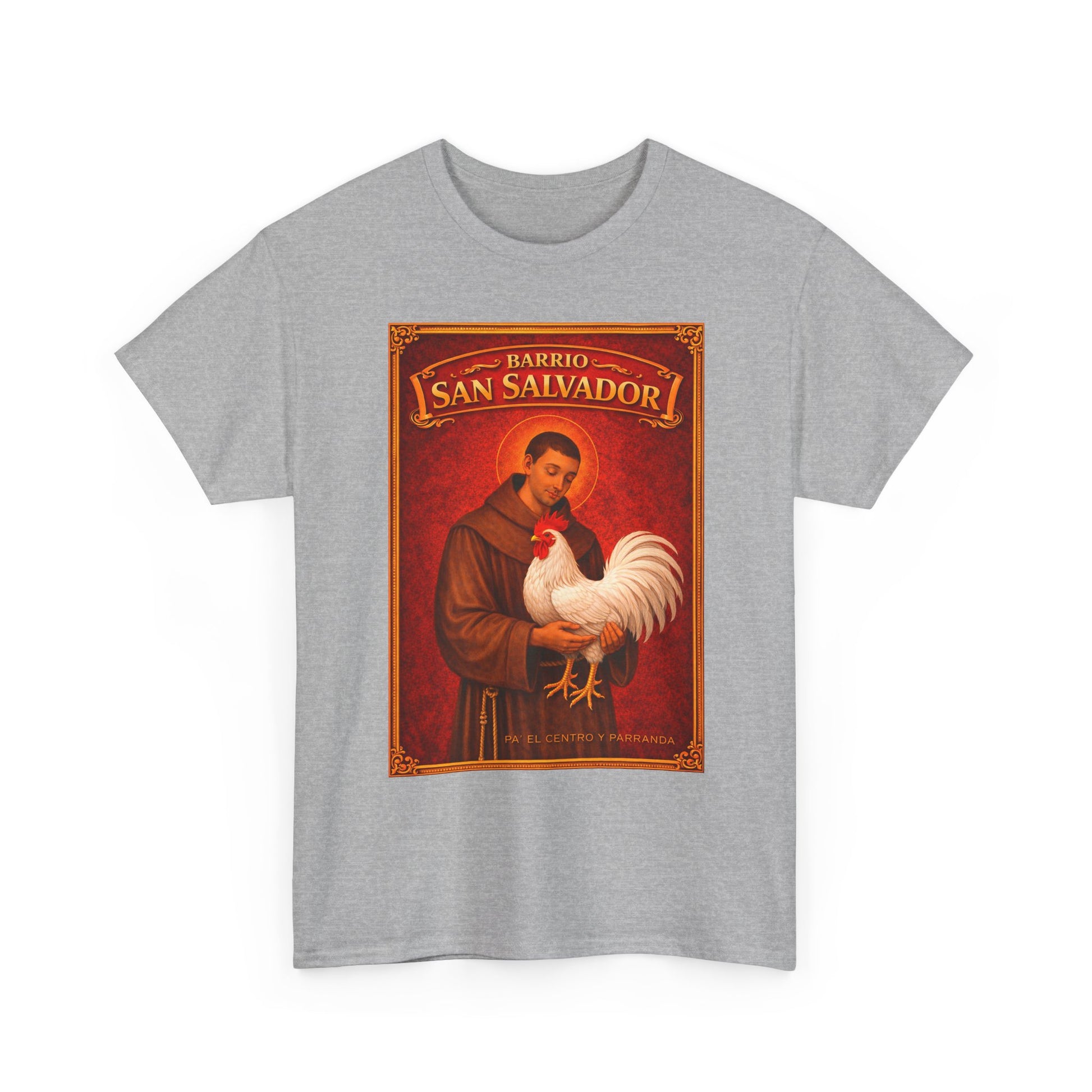 A relaxed, everyday tee that feels like a quiet nod to tradition and community. The front shows a vintage-inspired devotional image with warm sepia tones and a proud rooster, while the back carries a curved, understated wordmark. It sits comfortably on the body with a classic crew neckline and midweight cotton that holds prints crisply. Wear it to neighborhood gatherings, cultural events, or when you want clothing that whispers character rather than shouts it. The soft, durable fabric and clean construction make this shirt something you’ll reach for again and again — a simple way to carry a familiar story with you.