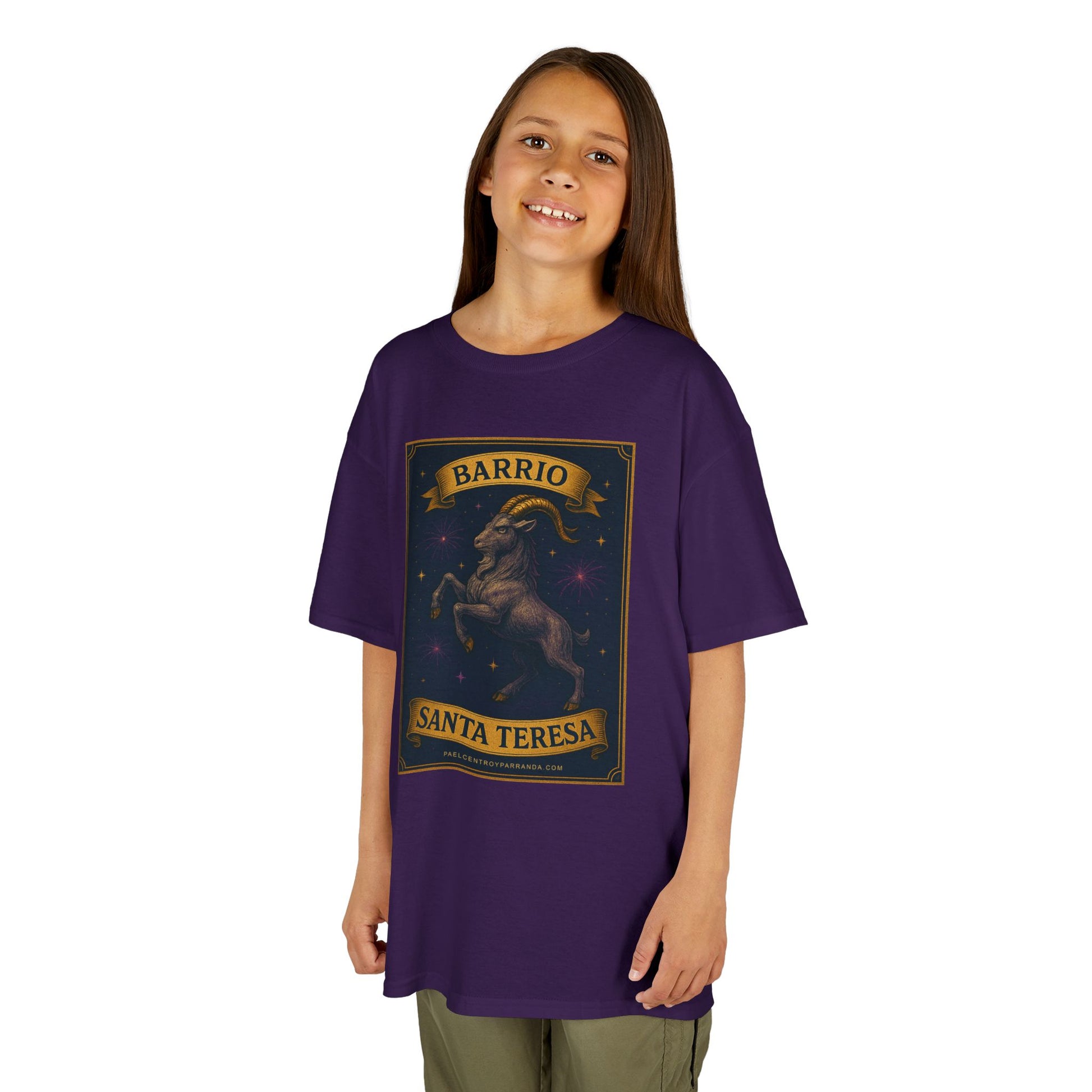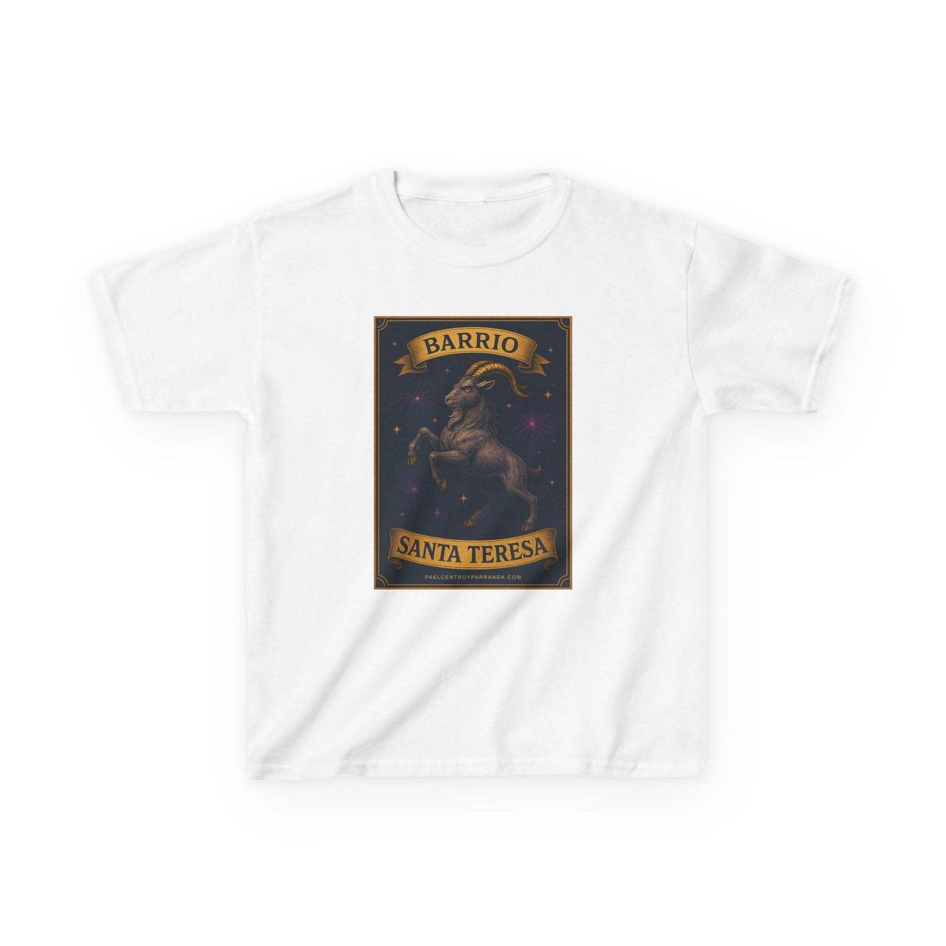 This kids’ tee carries a proud barrio vibe — bold, warm, and a little mischievous. The front panel shows a strong, stylized goat figure framed by a vintage banner that reads “Barrio” above and “Santa Teresa” below, set against a star-speckled night sky. The midweight 100% US cotton feels soft against the skin while holding the print’s rich colors. Cut for everyday wear with a classic crew neckline and tear-away label, it’s built to move with kids and stand up to play. Wear it to celebrate neighborhood roots, local festivals, or just to add character to a casual day out.